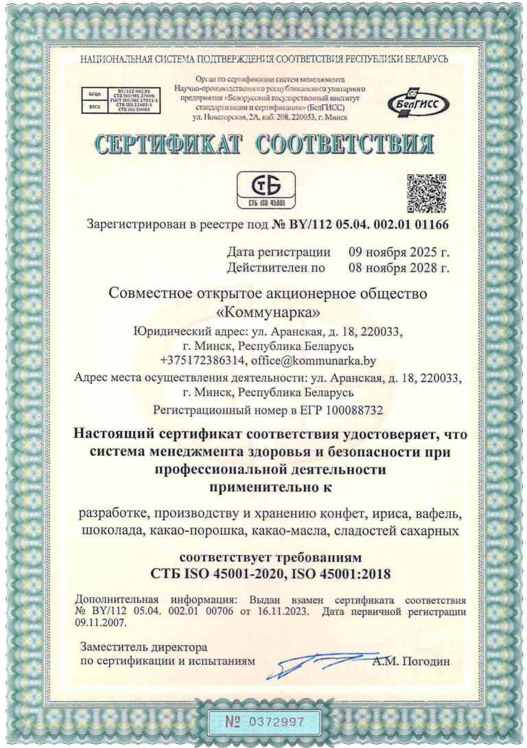 - система менеджмента здоровья и безопасности при профессиональной деятельности в соответствии с требованиями СТБ ISO 45001-2020, ISO 45001:2018;