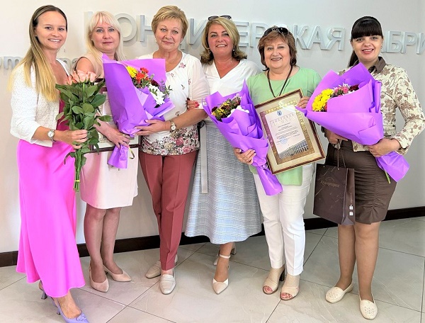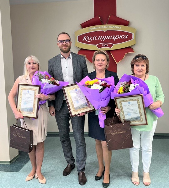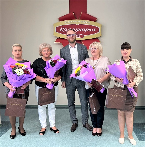 Все награжденные получили грамоты, букеты цветов и коробки конфет, а также творческие поздравления от артистов художественной самодеятельности нашей фабрики: Яны Горин, Ольги Бернюкевич и Александра Жиденя.