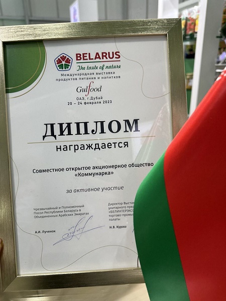 За актыўны ўдзел у рабоце выставы Gulfood 2023 у Дубаі СААТ «Камунарка» ўзнагароджана дыпломам, падпісаным Надзвычайным і Паўнамоцным Паслом Рэспублікі Беларусь у Аб'яднаных Арабскіх Эміратах Анрэем Іванавічам Лучанком, а таксама дырэктарам выставачнага ўнітарнага прадпрыемства «Белінтэрэкспа» Беларускай гандлёва-прамысловай палаты Наталляй Валер'еўнай Кураш.